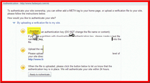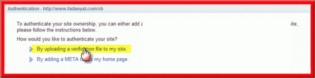 هنا سنقم بتحميل كود التحقق من ملكيه الموقع كما بالصوره ومن ثم سنقم برفعها الى رئيسية الموقع بالـ ftp