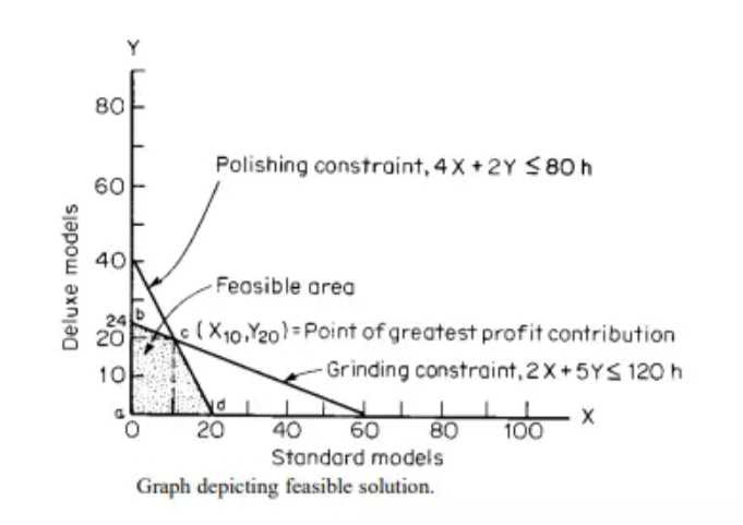 a graph (Fig. 17.1.5) is drawn with the constraints shown. The two-dimensional graphic technique is limited to problems having only two variables—in this example, standard and deluxe models. However, more than two constraints can be considered, although this case uses only two, grinding and polishing.