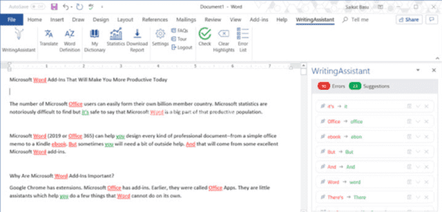 إضافة WritingAssistant: من الإضافات الرائعة جدًا و التي تمكن من حل هذه مشكلة عدم إتقان اللغة الإنجليزية، حيث أنها تقوم بإظهار الأخطاء الإملائية وأخطاء القواعد في الكتابة، ويمكنك استخدامها مع المدقق الإملائي الموجود في الوورد من أجل تحقيق أقصى استفادة منها والحصول على ملف خالي تمامًا من الأخطاء اللغوية.