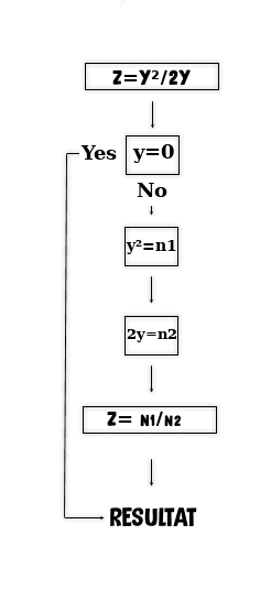 لحساب معادلة ما مثلا Z=y²/2y ، تبدأ الخوارزمية بحساب المقام أولا و تتأكد أنهُ لا يساوي الصفر (الاختيار)، ثم تحسب ضعف العنصر (y)، ثم تحسب مربع العنصر (y)، ثم بعد ذلك تقوم بحساب ناتج القسمة.